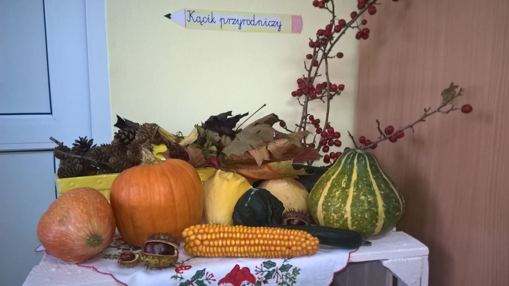 Przynieśliśmy do klasy dary jesieni i przyozdobiliśmy nimi nasz kącik przyrodniczy.