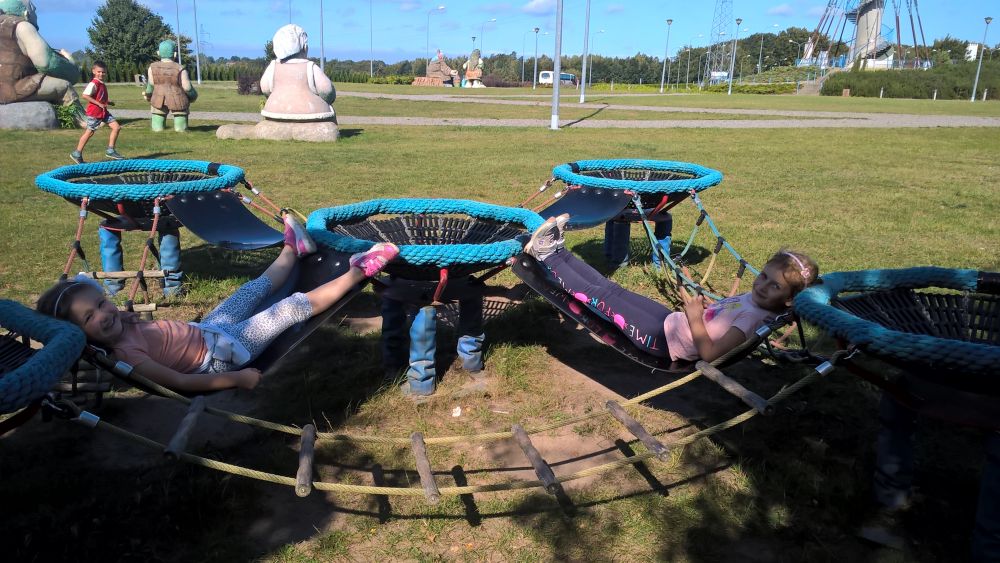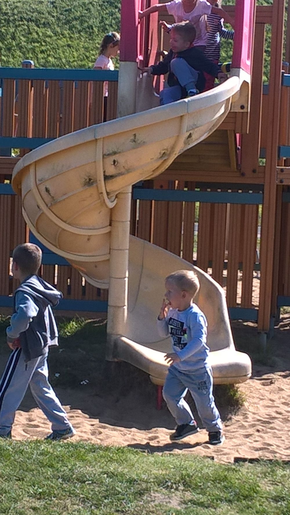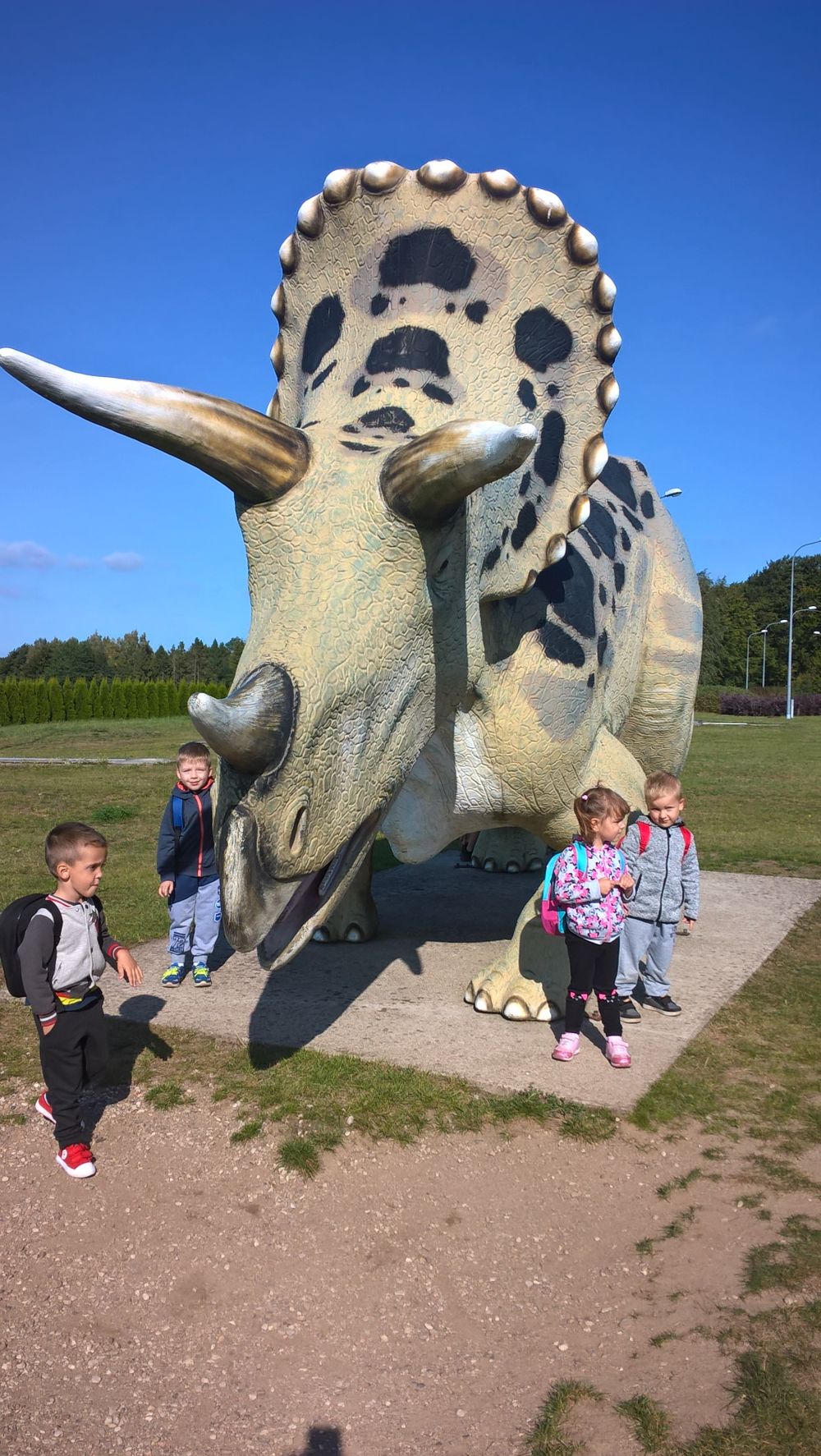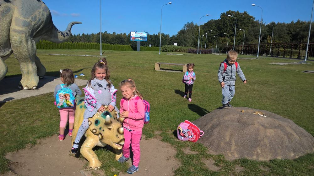 Kolejnymi punktami programu wycieczki było oglądanie figur dinozaurów i stolemów oraz zabawa na placu zabaw. Dzieci korzystały z huśtawek, zjeżdżalni, hamaków oraz piaskownicy. Z uśmiechami na buziach wróciły do sali Oddziału Przedszkolnego, gdzie czekał na nie ciepły posiłek.