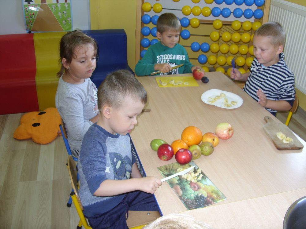 Korzystając z darów tak pięknej pory roku nasi milusińscy z wielkim zaangażowaniem wzięli się do pracy i przygotowali sałatkę owocową i szaszłyki. Nikogo nie trzeba było namawiać do degustacji. Sałatka bogata w witaminy wszystkim smakowała, o czym świadczyły pozostawione puste miseczki.