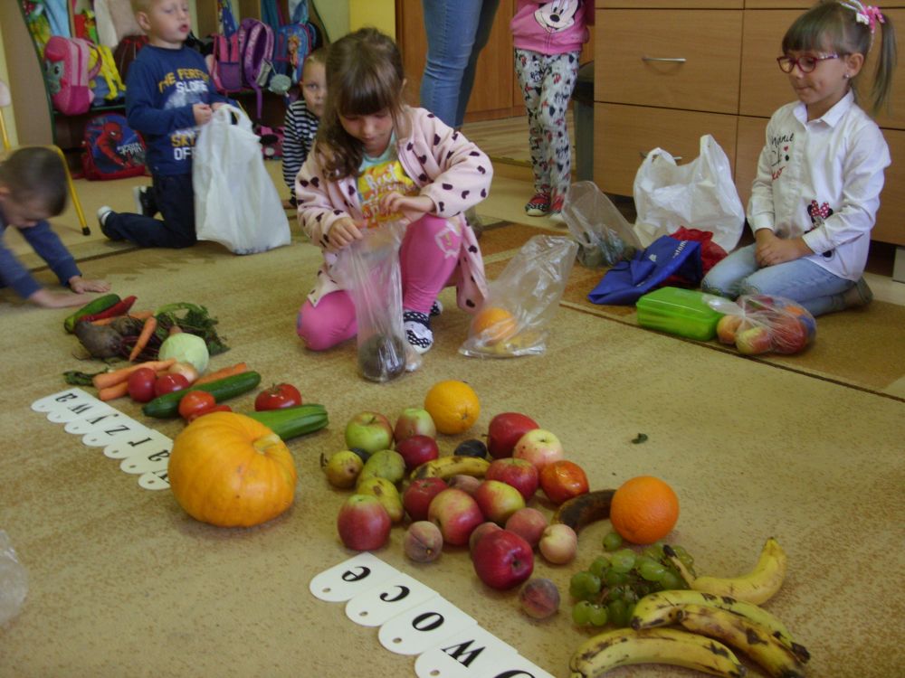 Przedszkolaki przyniosły również dary jesieni. W kąciku przyrody znalazły się: jabłka, gruszki, banany, marchewki, buraczki, ziemniaki... Kącik przyrody wygląda jak stragan owocowo - warzywny.