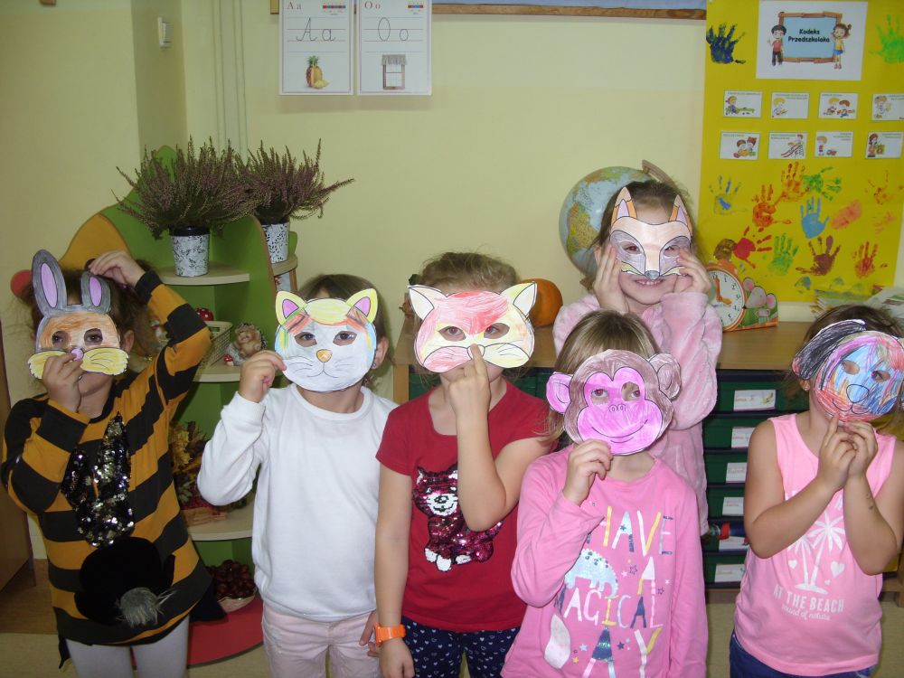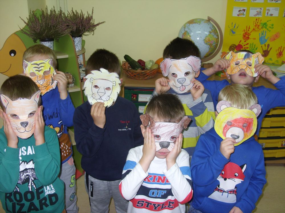 Po części tematycznej milusińscy przystąpili do wykonania masek zwierząt. Ozdobili nimi swoje twarze, zamieniając się w ulubione zwierzaki.