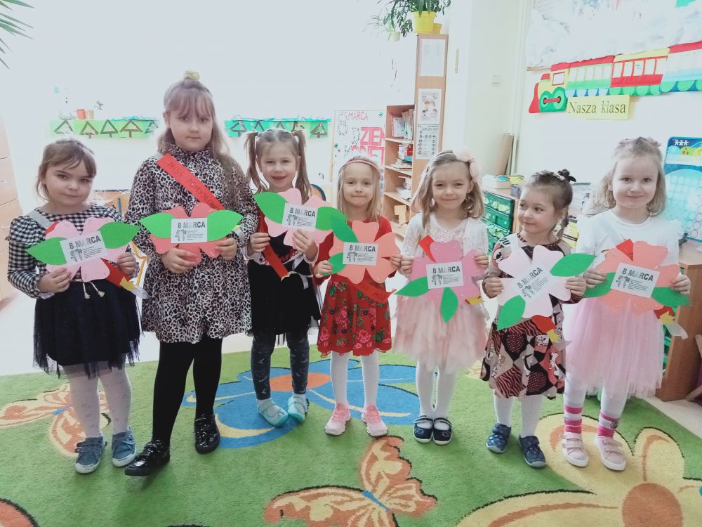8 marca świętowaliśmy Dzień Kobiet. Jako grupa przygotowaliśmy papierowe kwiatki i kartki z życzeniami dla wszystkich Pań pracujących w szkole. Wręczaliśmy je rano uśmiechniętym Paniom.