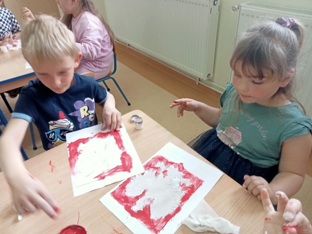Przygotowywaliśmy się też do obchodów Święta Konstytucji 3 Maja. Uczyliśmy się prawidłowej postawy podczas śpiewu naszego hymnu państwowego. Przypomnieliśmy sobie także jego tekst i brzmienie. Poznaliśmy fragment historii Polski związany z datą 3 maja oraz palcami malowaliśmy godła Polski.