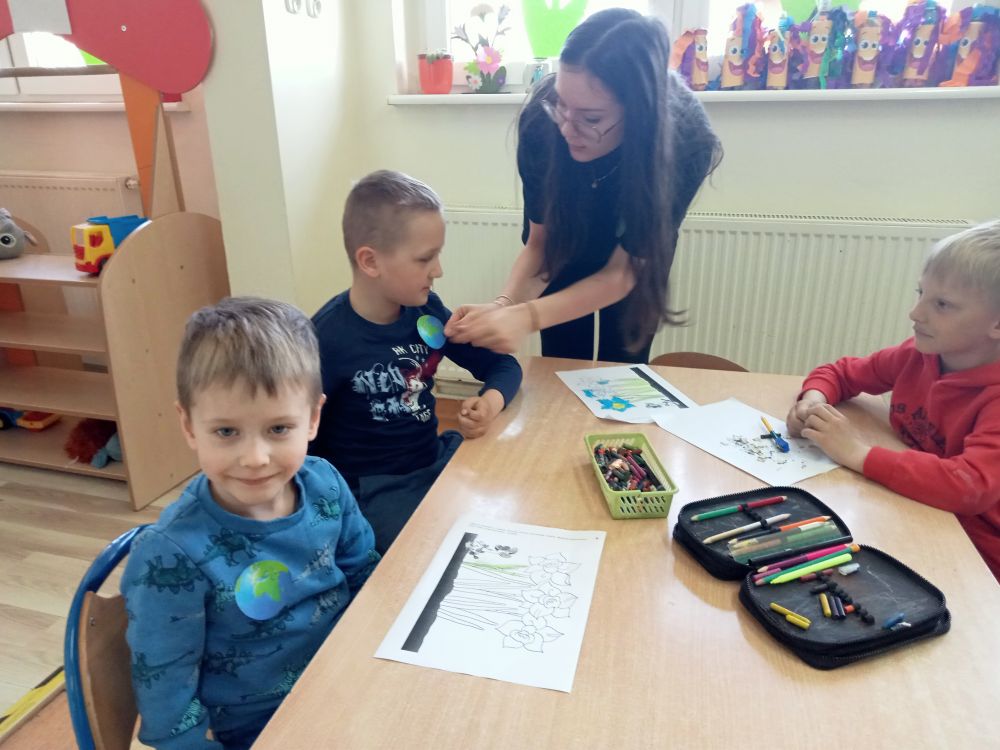 W Dniu Ziemi otrzymaliśmy emblematy Ziemi od uczennic z 8 klasy i wzięliśmy udział w przygotowanej przez nie pogadance.