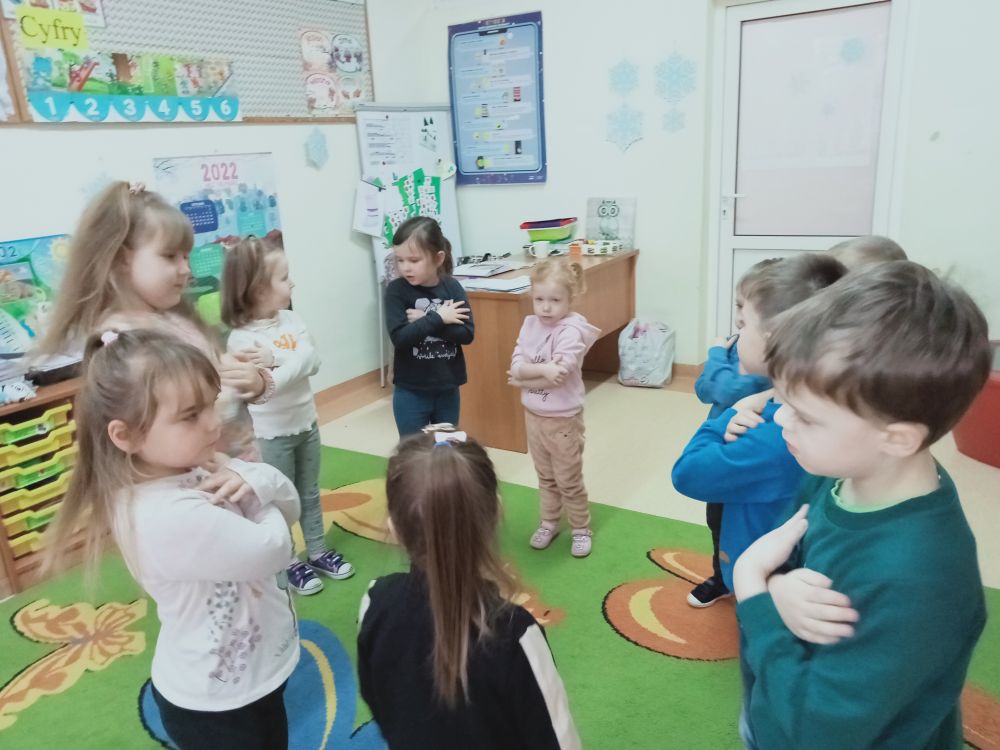 W styczniu rozmawialiśmy o czasie, który nieustannie upływa. Przypomnieliśmy sobie nazwy dni tygodnia, miesięcy i pór roku. Zapoznaliśmy się z różnymi formami kalendarza. Zastanawialiśmy się, co by było, gdyby zegar i kalendarz nie istniały? Rozmawialiśmy także o naszych zajęciach i obowiązkach w domu w poszczególne dni tygodnia. Uzupełnialiśmy również karty pracy dotyczące rytmów. Nauczyliśmy się śpiewać piosenki pt. "Płynie czas". Z radością śpiewaliśmy przede wszystkim refren z podziałem na płeć.