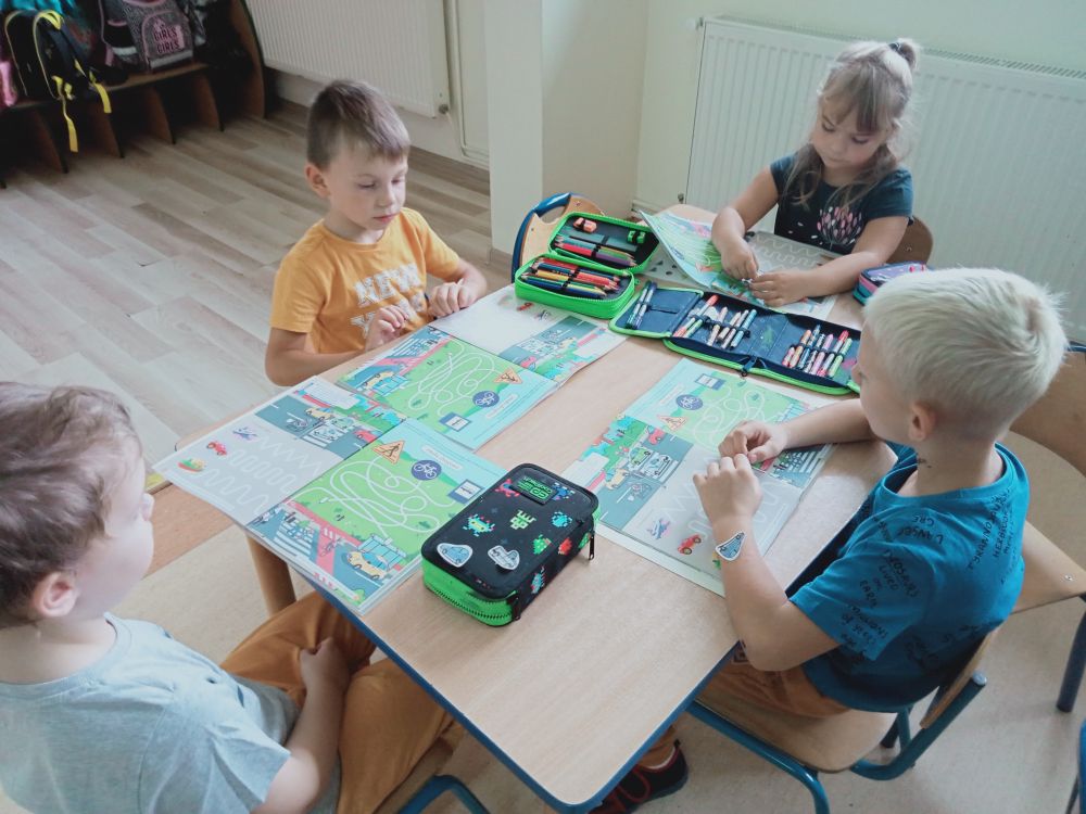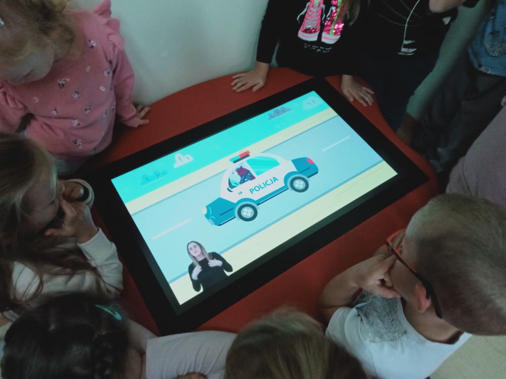 Poznaliśmy zasady ruchu drogowego i wygląd znaków drogowych, w czym pomógł nam duży tablet stojący w sali. Wyszukiwaliśmy też przedmioty o tym samym kształcie, co znaki drogowe. Okazuje się, że jest ich całkiem sporo.