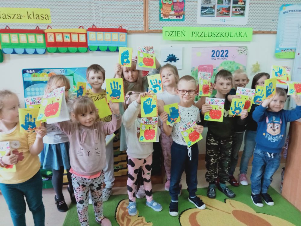 We wrześniu obchodziliśmy Dzień Przedszkolaka. Przedszkolaki odcisnęły swoje dłonie umoczone w farbie na laurce z życzeniami. Będzie to dla nich pamiątka na całe życie. Otrzymały również kolorowanki i razem wzięły udział w poczęstunku.