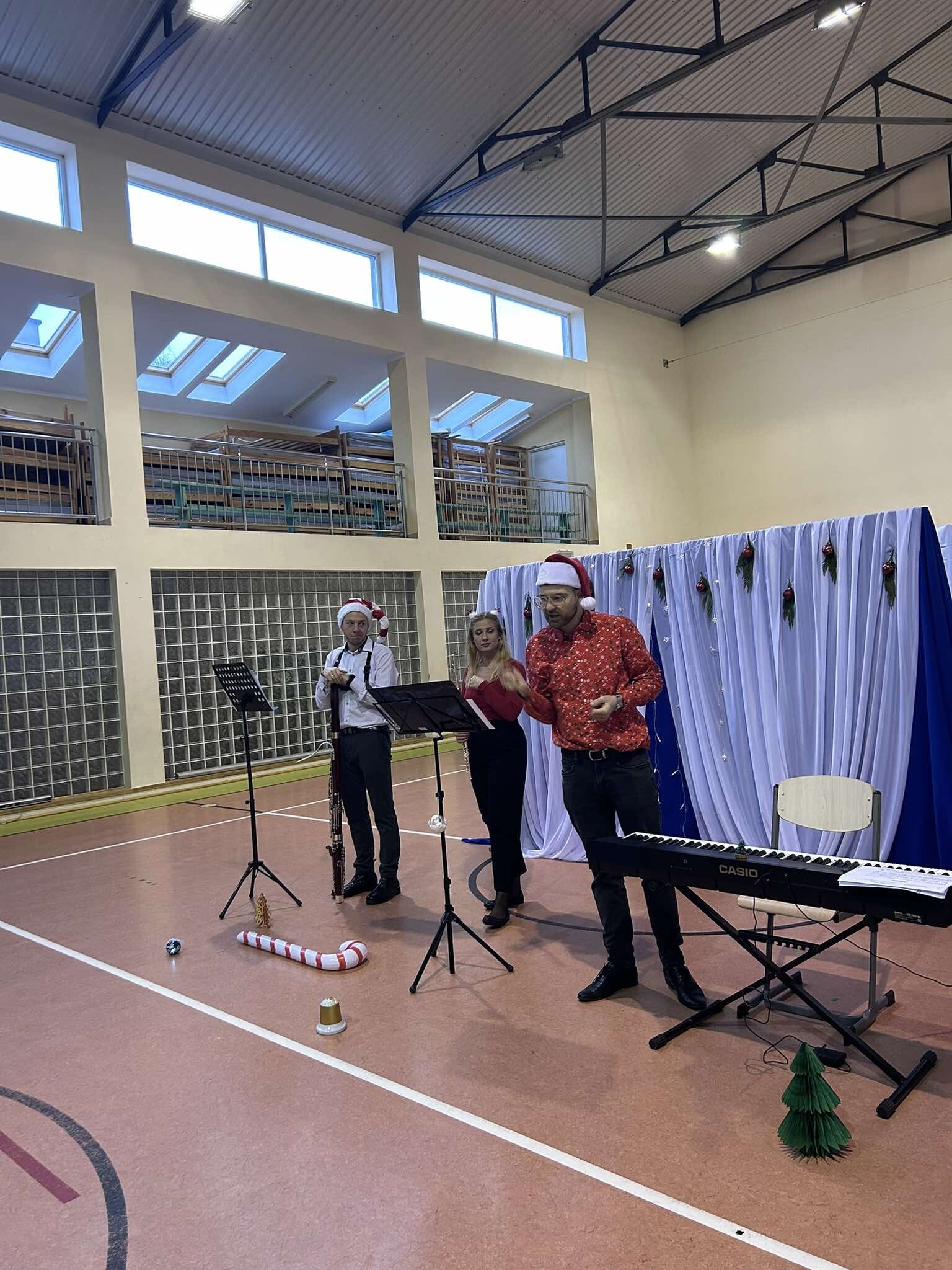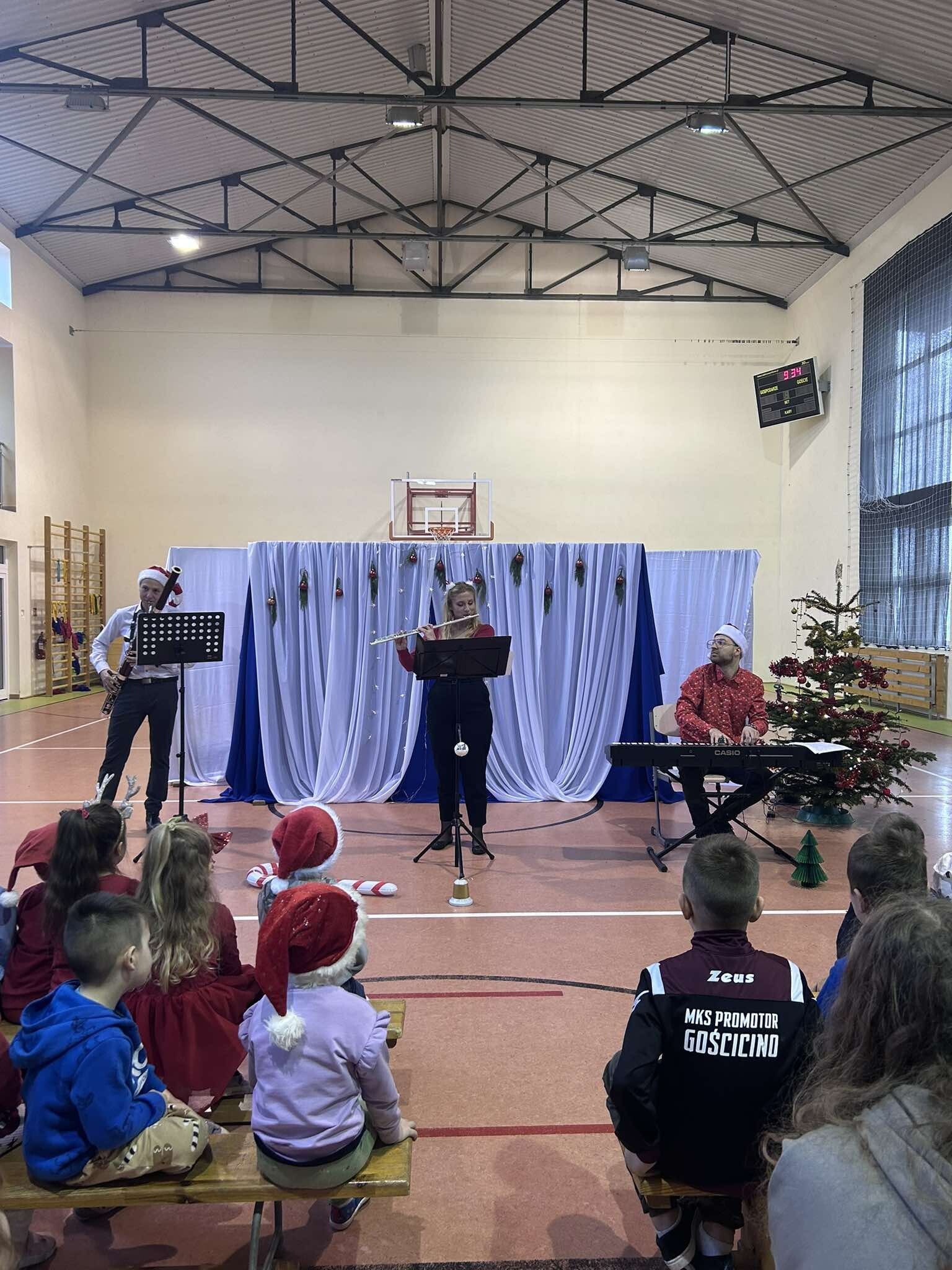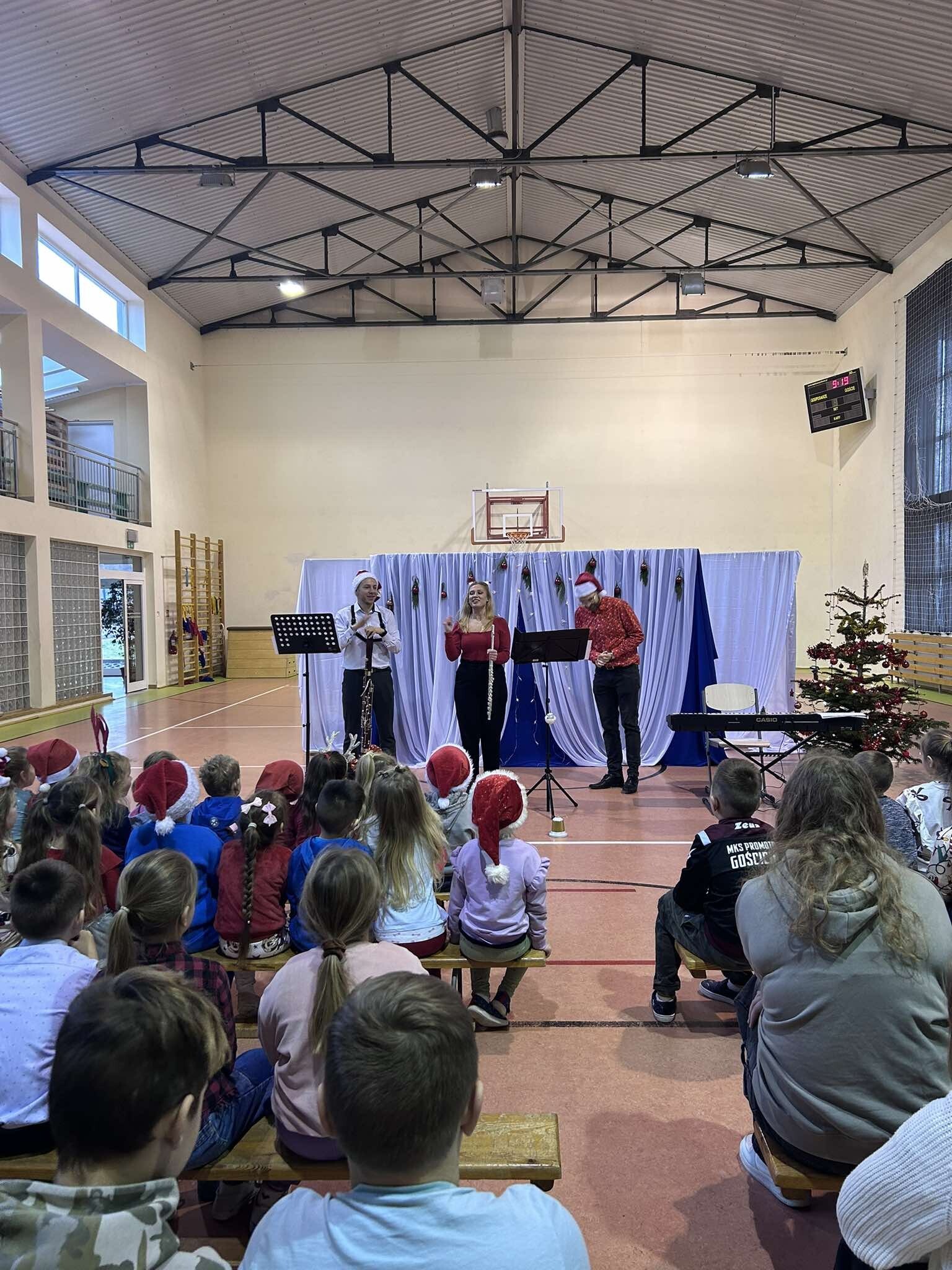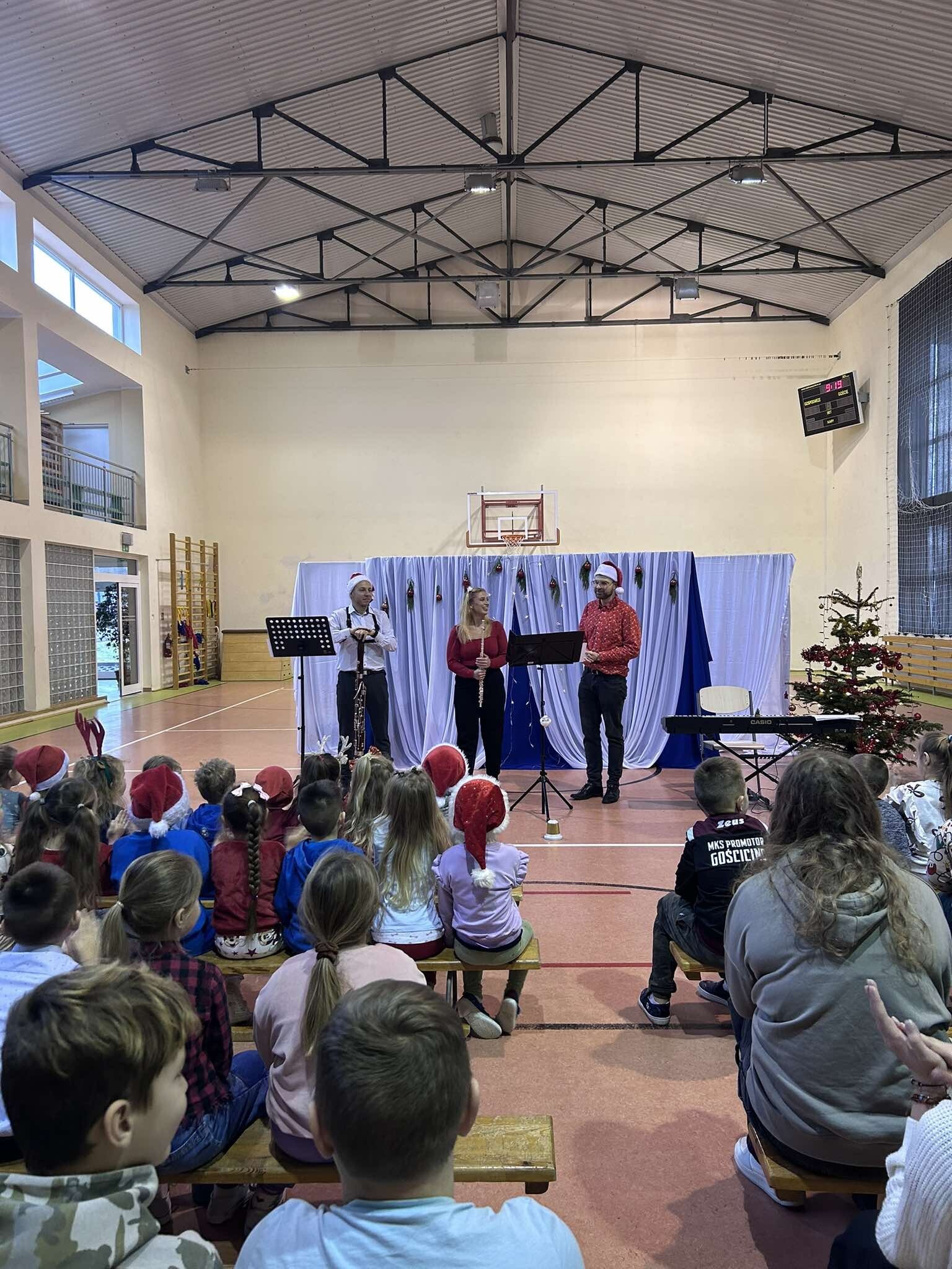 Dzisiaj naszą szkołę odwiedzili muzycy z Agencji Artizma, którzy wprowadzili nas w świąteczny nastrój grając najpiękniejsze polskie kolędy. Dzieci miały możliwość zobaczyć i posłuchać jak brzmią niektóre instrumenty, takie jak: pianino elektryczne, flet i fagot. W sali gimnastycznej zagościła niezwykła atmosfera, uczniowie z radością śpiewali kolędy razem z artystami. Wizyta muzyków była wspaniałym momentem, który dodał blasku przedświątecznemu czasowi.