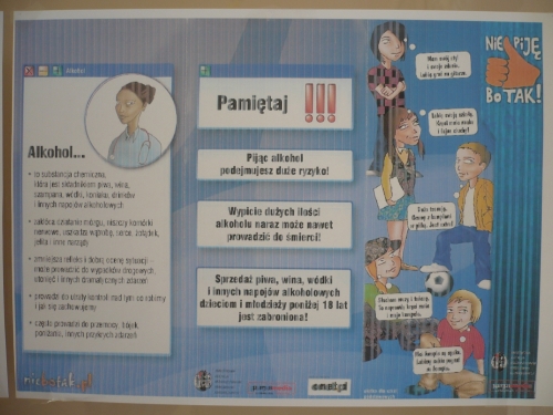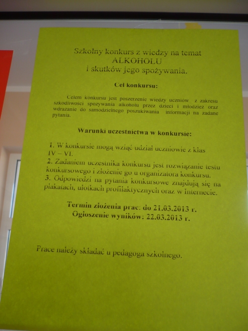 W dniach 18 – 21.03.2013 r. zaplanowano szkolną akcję profilaktyczną dla klas IV – VI pt. „Alkohol – STOP”.