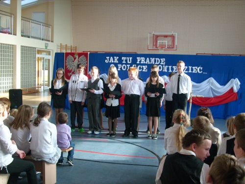 Jak co roku w naszej szkole odbyła się uroczysta akademia z okazji 95 rocznicy odzyskania przez Polskę niepodległości. Montaż słowno - muzyczny pod hasłem "Jak tu prawdę o Polsce powiedzieć... " przygotowali uczniowie klasy V i VI pod kierunkiem p. I.Klich i p. I.Brzeskiej.