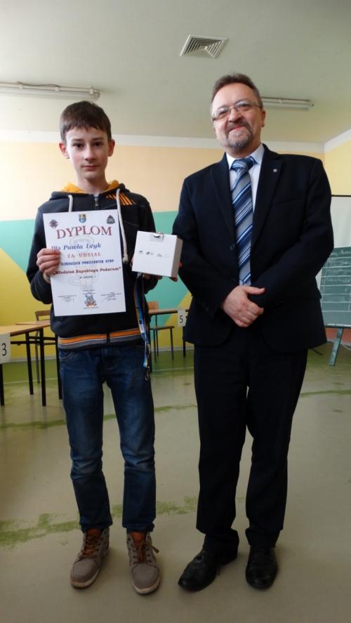 Turniej podobnie jak etap gminny składał się z dwóch części. W części pisemnej uczniowie rozwiązywali test składający się z 30 pytań. Po sprawdzeniu części pisemnej 5 uczestników turnieju zakwalifikowało się do części ustnej. Wśród nich znalazł się nasz uczeń Paweł Leyk zdobywając 22 punkty. W części ustnej Paweł miał trochę trudności z udzieleniem wyczerpujących odpowiedzi na wylosowane pytania co sprawiło, że ostatecznie zajął dobre IV miejsce.