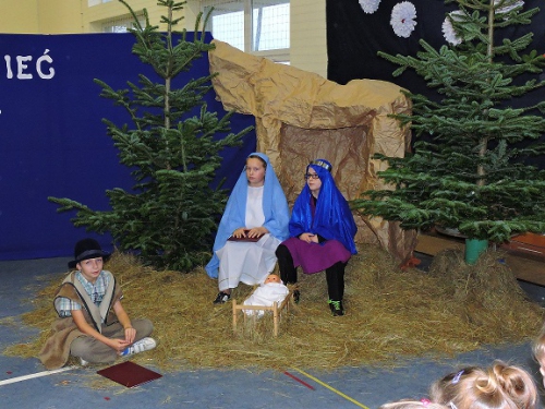 Boże Narodzenie to szczególny dla wszystkich czas. W dniu 19.12.14 r. w naszej szkole odbyły się "Jasełka". W przedstawieniu wzięli udział uczniowie klas 4-6, których po raz pierwszy przygotowywała nasza katechetka, Angelika Wiśniewska. Nieocenioną pomocą w aranżacji muzycznej występu, była pani Iwona Klich, która wraz z panią Izabelą Brzeską, zajęła się również całą scenografią. Dzieci około miesiąca aktywnie przygotowywały się na tą uroczystość. Wcieliły się w rolę: Maryi, św. Józefa, Trzech Króli, pastuszków, aniołów, a także znanych postaci z bajek, które z radością przybywały do stajenki powitać i złożyć Jezusowi dary. Wszyscy razem śpiewali różne świąteczne utwory m.in.: "Świeć gwiazdeczko świeć", "Daj mi znak", czy "Wesołych Świąt życzę Wam". Całość dopełniły barwne stroje naszych aktorów. Wszystko to sprawiło, że poczuliśmy magię świąt i ich niepowtarzalny charakter i czar.