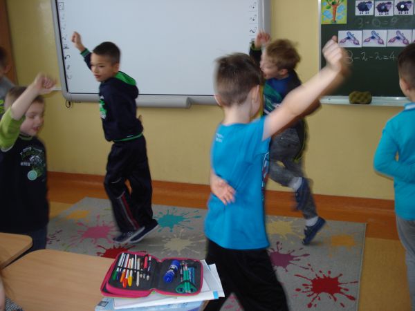 Poznaliśmy pojęcie kapela góralska oraz instrumenty używane w takiej kapeli. Wysłuchaliśmy góralskich przyśpiewek i dźwięków muzyki granej podczas wesela góralskiego. Następnie zatańczyliśmy w rytm góralskiej muzyki. Najpierw zadania podjęli się chłopcy, a potem dziewczynki. Chłopcy bardzo zaangażowali się w improwizacje ruchowe i starali się naśladować taniec z ciupagami oraz ćwiczyli hołubce. Obie grupy wspaniale poradziły sobie z naśladowaniem góralskiego tańca.