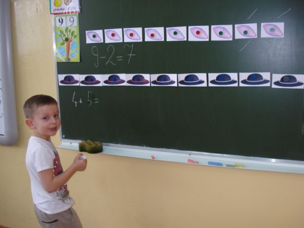 Rozwiązywaliśmy zadania tekstowe w zakresie 9. Działania zapisywaliśmy na tablicy oraz na dodatkowych kartach pracy.