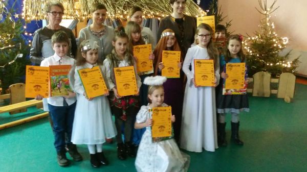Konkurs skierowany był do uczniów kl. I - III. Naszą szkołę reprezentowali: Emilia Nawotka, Dominik Leyk i Hubert Sanocki, którzy zwyciężyli w eliminacjach szkolnych. Soliści zaprezentowali tradycyjne, polskie kolędy i pastorałki. Za sprawą przepięknie wykonanych przez dzieci pieśni jeszcze raz można było poczuć magię Świąt Bożego Narodzenia. Jury po wysłuchaniu wszystkich uczestników przyznało nagrody i wyróżnienia. Emilka zdobyła II miejsce, a Dominik z Hubertem zostali wyróżnieni. Wszyscy uczestnicy otrzymali piękne nagrody książkowe. Gratulujemy.