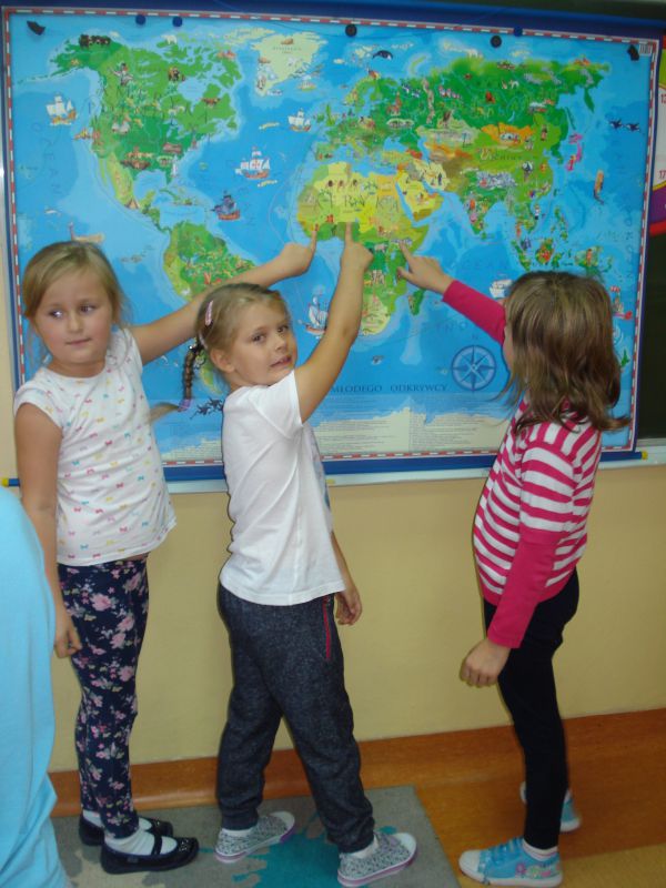 Zapoznali się z mapą i wskazali na niej Afrykę- kontynent, na który wybrał się John Dolittle. Korzystając z mapy, dzieci odczytały nazwy gatunków zwierząt występujących w Afryce oraz przeanalizowały ciekawostki na ich temat. Wykonały również wiele ciekawych zadań w oparciu o karty pracy, które dostarczyły im wiedzy na temat życia w Afryce.