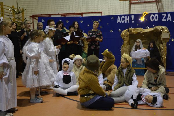 W świąteczny klimat wprowadziły wszystkich przygotowane przez uczniów kl. I-III jasełka pt. „Ach! Co za noc!” Młodzi aktorzy z pełnym zaangażowaniem, przedstawili historię narodzenia Jezusa. Całość przedstawienia przeplatana była pastorałkami i piosenkami świątecznymi w wykonaniu dzieci a także pracowników szkoły, tworzącymi ten niepowtarzalny klimat radości i refleksji. Ogromne zaangażowanie młodych aktorów opłaciło się, gdyż przedstawienie zostało nagrodzone gromkimi brawami.