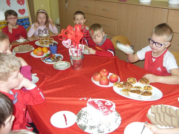 Walentynkowe zabawy zakończona słodkim poczęstunkiem.