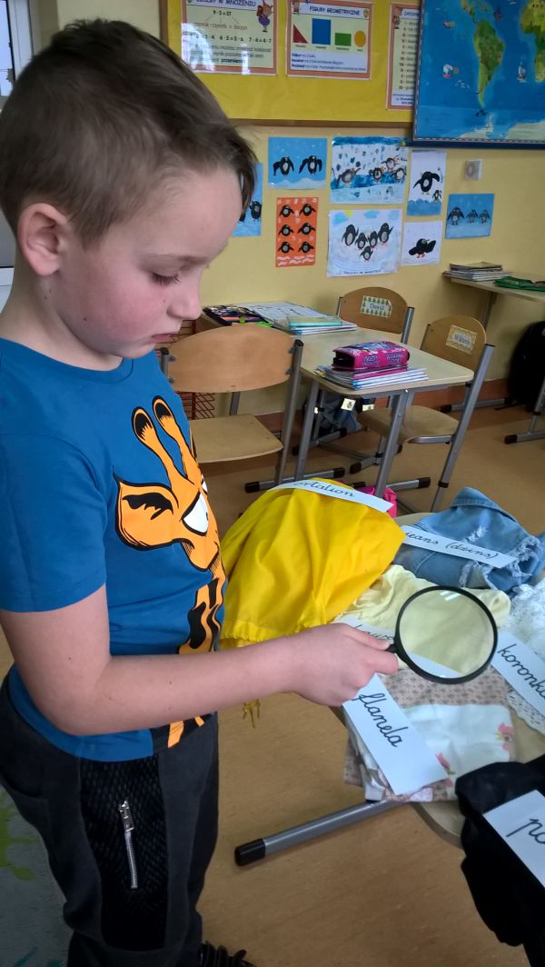 Chętne dzieci opisywały swój strój dzienny, określając materiał, z jakiego zostały uszyte jego poszczególne elementy. Odczytały składy materiałów z metek ubraniowych. Poznały również rodzaje splotów tkackich, a zgromadzone materiały obserwowały przez lupę, próbując określić rodzaj splotu.