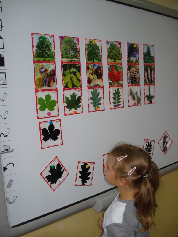 Podpisały także sylwety liści na kartach pracy i połączyły nazwy drzew z ich owocami. Dopasowały liście z ich cieniami oraz zatańczyły z podziałem na role do piosenki pt. „W lesie”.