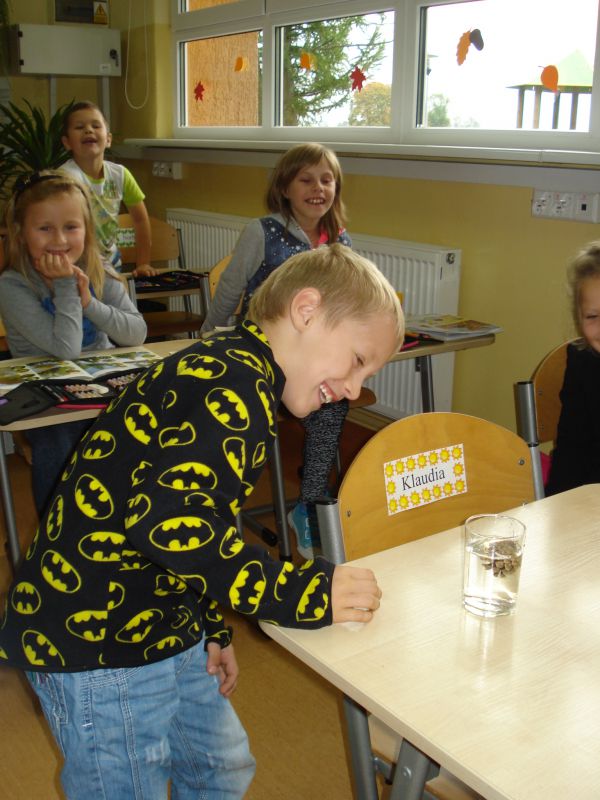 Szymon wykonał doświadczenie mające na celu sprawdzenie, co dzieje się z szyszką po zanurzeniu jej w wodzie na dwie godziny. Uczniowie przyjrzeli się także darom natury przyniesionym wcześniej do klasy. Określali, z jakich drzew pochodzą jesienne dary natury.
