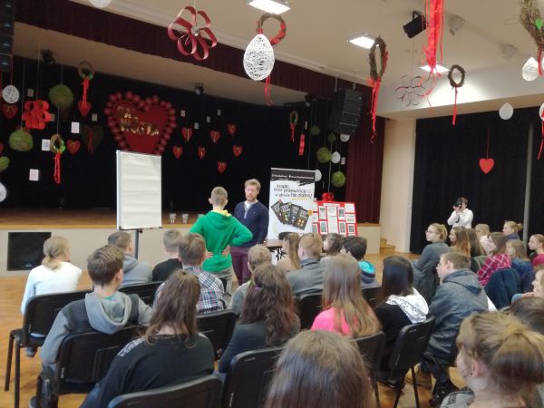 W miniony czwartek 23 lutego uczniowie z klasy VI oraz I gim. udali się do Gminnego Ośrodka Kultury i Sportu w Wicku na warsztaty z Michałem Zawadką - autorem książek motywacyjnych dla dzieci i młodzieży. Podczas spotkania uczniowie mogli dowiedzieć się jak dążyć do zrealizowania swoich marzeń, jak umiejętnie wybierać własną drogę, aby osiągnąć zamierzone cele. Ponadto poruszone zostały kwestie funkcjonowania w grupie rówieśniczej - co robić, aby nie ulegać presji grupy oraz jak istotna jest zmiana podejścia z "oceniania kogoś" na "docenianie kogoś". Dzięki niekonwencjonalnemu podejściu prowadzenia warsztatów pan Zawadka zjednał sobie wszystkich zebranych na sali. Co więcej zachęcał do dyskusji, przemyśleń oraz zastanowienia się nad niektórymi sprawami. Dzięki przykładom z życia wziętym przekonywał, że nie ważny jest status społeczny - najważniejsza jest wiara w siebie i determinacja. Wówczas każdy nawet najbardziej odległy i nierealny cel może zostać spełniony.