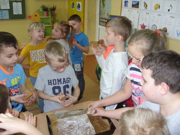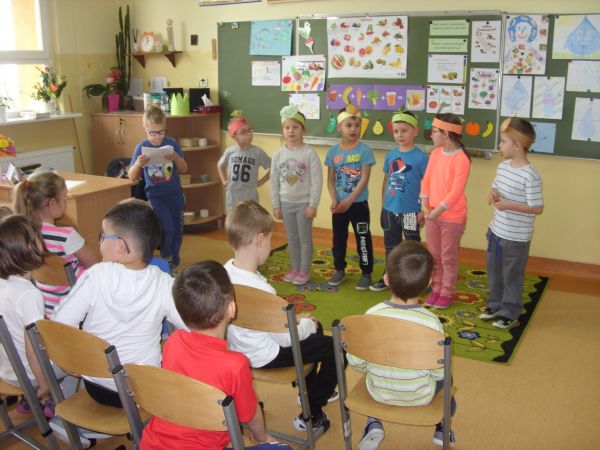 W ramach działań konkursu Zdrowo jem, więcej wiem uczniowie klasy I upiekli także przepyszne, zdrowe, bez konserwantów ciasto marchewkowe oraz przygotowali teatrzyk, którego celem było ukazanie walorów zdrowotnych warzyw i owoców oraz zachęcanie do ich spożywania. Mali aktorzy, zaprezentowali koleżankom i kolegom z przedszkola: „Niech żyje król ziemniak” – teatrzyk sylwet na podstawie utworu E. Stadtmiller. Spektakl urozmaiciły piosenki warzywno – owocowe. Dzieci wspólnie się bawiły przy muzyce.