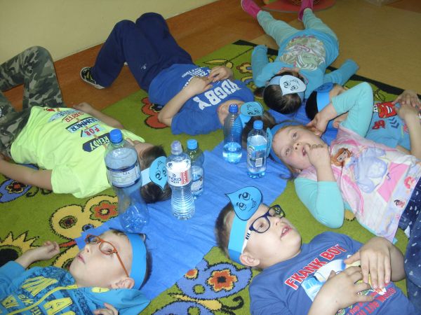 Dzieci brały udział w eksperymentach. Pierwszy polegał na przenoszeniu wody za pomocą gąbki. Na koniec sprawdzały - przy pomocy naczynia odmierzającego ilość płynu – stan „przeniesionej” wody. Okazało się, że w trakcie przenoszenia trochę jej ubyło. Dowiedziały się, że podobnie dzieje się w naszym organizmie, który traci wodę z moczem, potem, łzami, z wydychanym powietrzem itp. Dlatego, aby zachować zdrowie i zapobiegać utracie wody z organizmu należy pić wodę, która gasi pragnienie. W związku z tym uczestnicy przygotowali wody smakowe: cytrynową, pomarańczową, truskawkową. Dzieci próbowały każdego napoju i przyklejały gwiazdki, przy tym napoju, który im smakował. Tak przygotowana woda smakowa świetnie gasi pragnienie, dostarcza naturalnych witamin zawartych w owocach, nie obciąża organizmu niezdrowymi dodatkami.