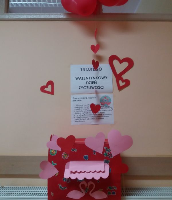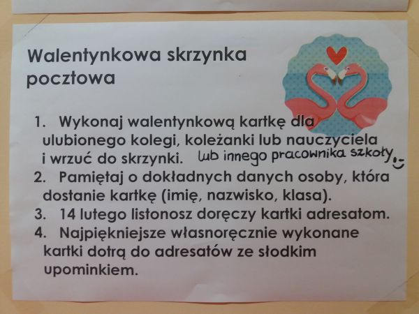 Do jutra można wrzucać do naszej walentynkowej skrzynki pocztowej kartki życzliwości dla ulubienic i ulubieńców spotykanych w szkolnych murach. Kartki mogą być anonimowe, ale powinny być na nich umieszczone wyraźnie napisane dane adresata (imię, nazwisko, klasa). Najpiękniej wykonane kartki listonosz walentynkowy dostarczy wraz ze słodkim upominkiem. Zapraszamy do zabawy!