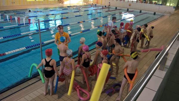 Po wstępnych zajęciach i ćwiczeniach w brodziku trzecioklasiści uczą się właśnie pływać w dużym basenie pod okiem instruktorki.