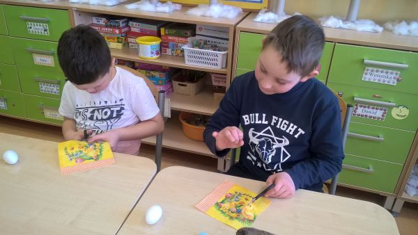 Własnoręcznie ozdabialiśmy jajka wielkanocne, wykorzystując do tego technikę decoupage’u. Gotowe pisanki zawisły na naszych klasowych baziach.