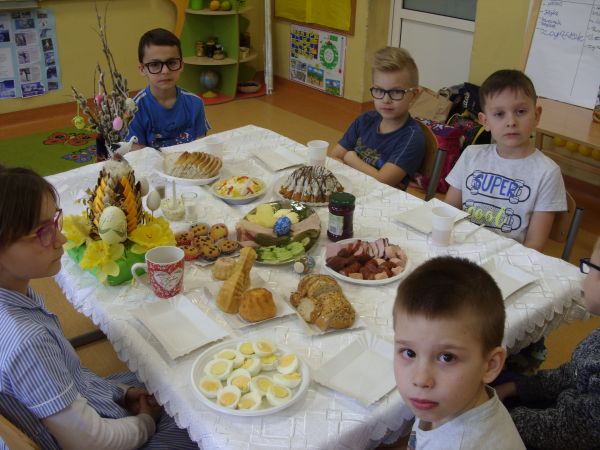 W Wielką Środę, tuż przed udaniem się na świąteczną przerwę, w naszej klasie odbyło się wielkanocne śniadanie. Uczniowie bardzo aktywnie włączyli się w przygotowania. Upiekli babeczki, obierali jajka, układali produkty, rozkładali talerzyki i sztućce. Następnie wszyscy usiedli do bogato zastawionego stołu, by złożyć sobie życzenia, podzielić się jajkiem i wspólnie delektować się świątecznymi przysmakami. Na wielkanocnym stole nie mogło zabraknąć jajek, kiełbaski, szynki, chleba, sałatki oraz babki wielkanocnej.