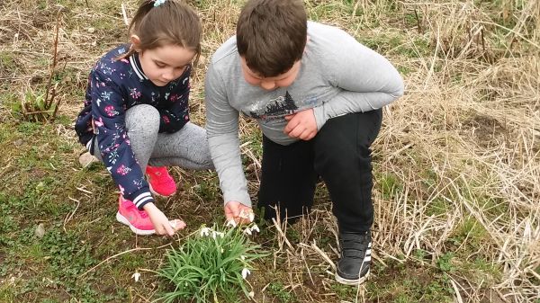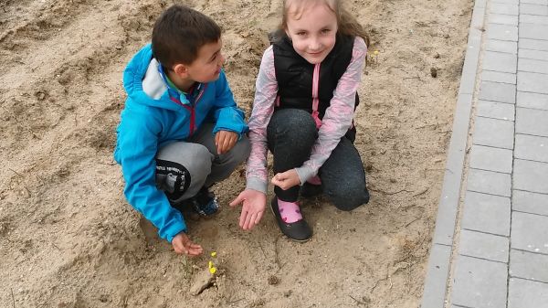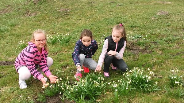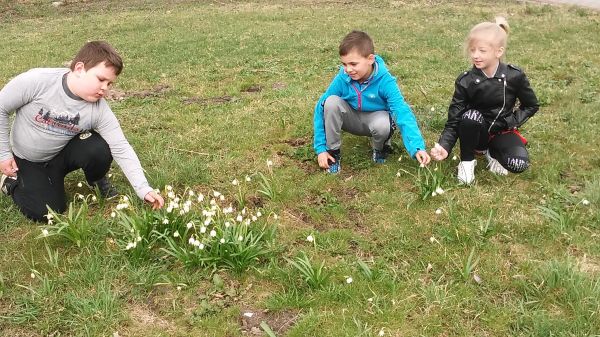 Czekając na wiosnę uczniowie z pierwszej klasy prowadzili obserwacje przyrodnicze. Podczas spaceru po najbliższej okolicy rozpoznawali pierwsze wiosenne kwiaty,