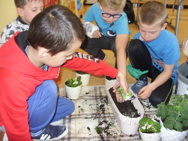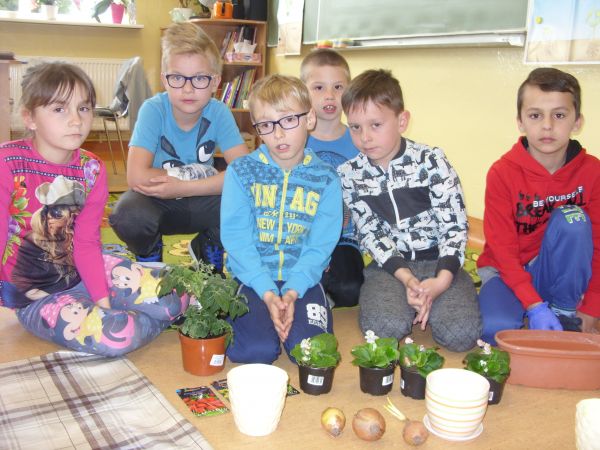 Uczniowie klasy drugiej przygotowali " Wiosenny ogródek", w którym z wielkim zaangażowaniem sadzili wiosenne kwiaty, siali nasiona sałaty, rzodkiewki.