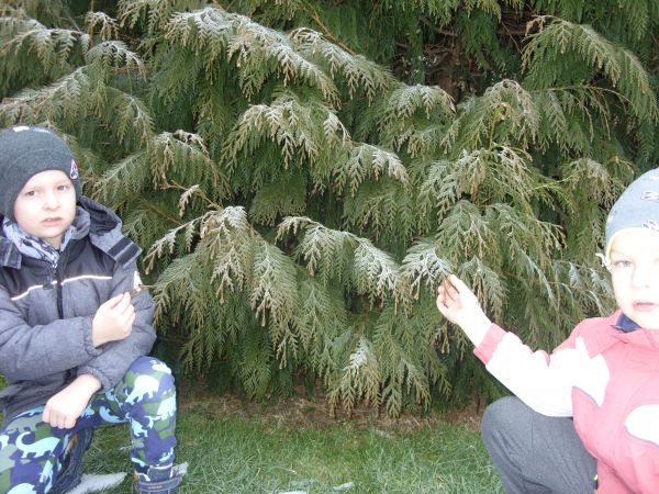 Uczniowie klasy drugiej zbierali informacje o zimie. Najlepszym sposobem przekazywania informacji na temat zimy była lekcja na dworze. Dzieci obserwowały płatki śniegu, oglądały szron na trawie i szadź na gałęziach drzew.