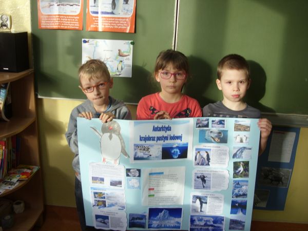 W czasie lekcji uczniowie poznali najzimniejsze krainy geograficzne i nadziwić się nie mogli, że krainy te tak bardzo różnią się od naszej. Wykonali też ciekawe plakaty o Antarktydzie i Arktyce.