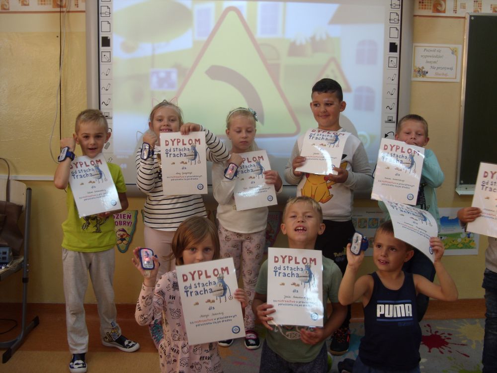 Podsumowaniem zajęć był praktyczny egzamin z przechodzenia przez jezdnię, który wszystkie pierwszaki zdały celująco. Oczywiście odblaski będą stałym elementem uczniowskich plecaków.