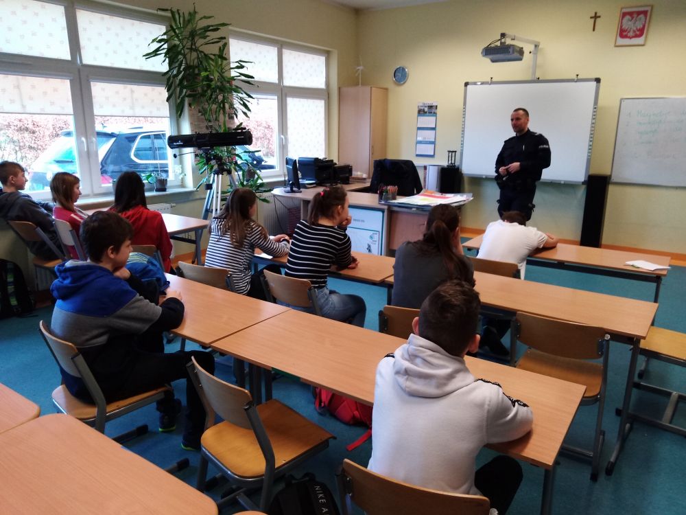 26 lutego odbyło się spotkanie klasy VII i VIII z funkcjonariuszem policji. Spotkanie dotyczyło zagrożeń jakie niesie ze sobą zażywanie substancji psychoaktywnych, a także cyberprzestępczości. Policjant zapoznał uczniów z procedurami, jakie są podejmowane w przypadku znalezienia u kogoś nielegalnych środków odurzających. Podczas lekcji nie zabrakło także informacji o dopalaczach, e-papierosach i cyberprzestępczości. Uczniowie dowiedzieli się czym może grozić nabywanie i zażywanie tego rodzaju substancji. Dzielnicowy apelował do uczniów o rozwagę i świadome podejmowanie decyzji, które mogą mieć wpływ na ich całe późniejsze życie.