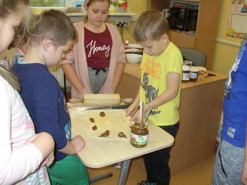 Uczniowie klasy drugiej przygotowali niespodziankę dla swoich kolegów. Od rana piekli rogaliki, którymi obdarują swoich młodszych i starszych kolegów. Wszyscy bardzo się starali, aby każdy rogalik był równiutki.