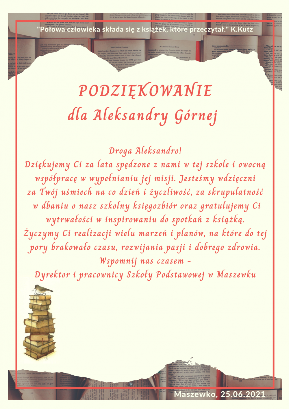 Dziękujemy za wszystko, czym dzieliła się Pani w naszej szkole: uśmiechy, dobre słowo, pogaduchy z dziećmi na przerwach, opowiadanie z pasją o książkach, szukanie odpowiedniej literatury dla każdej indywidualnej jednostki przychodzącej w progi biblioteki. Życzymy dużo zdrowia i spełniania marzeń na zasłużonym odpoczynku.