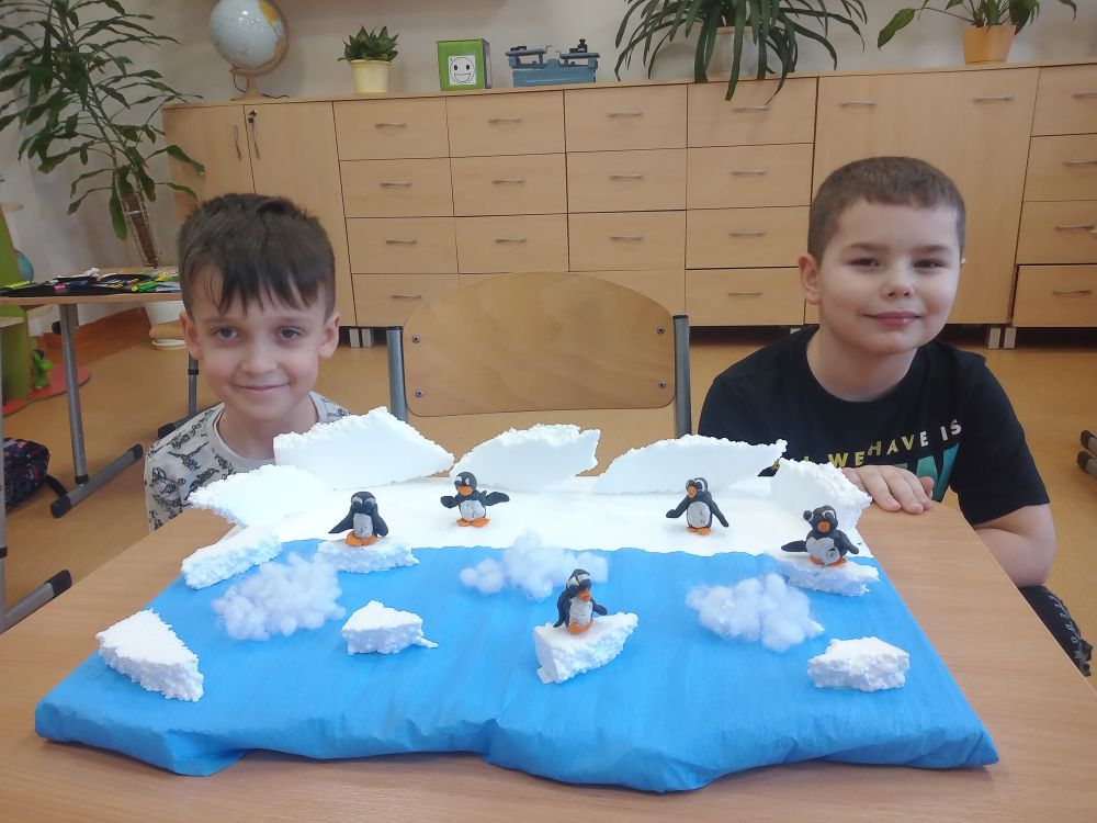 Uczniowie klasy II zgłębiali wiedzę na temat Arktyki i Antarktydy. Poznali warunki życia panujące na obu biegunach, zamieszkujące tam zwierzęta oraz dawne i współczesne zwyczaje mieszkańców Grenlandii. Tworzyli plakaty i makiety pokazujące krajobraz i zwierzęta. Dzieci sporządziły także opis pingwina oraz określały właściwości wody w różnych temperaturach. Dzięki wspólnej pracy drugoklasiści poznali wiele ciekawych informacji o tych odległych rejonach naszego globu.