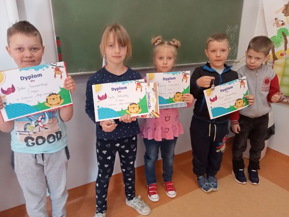 Zuzia i Nikola- uczennice klasy 3 zorganizowały konkurs plastyczny "Moje ulubione zwierzątko" dla klas 0-3. Konkurs został podzielony na dwie kategorie wiekowe: klasy 0-1 oraz 2-3. Łącznie wzięło w nim udział 8 uczniów z naszej szkoły. Spośród prac szybko wyłoniono zwycięzców, a trzeba zaznaczyć, że nie było osób, które nie zostałyby nagrodzone. Wyniki prezentują się następująco:
