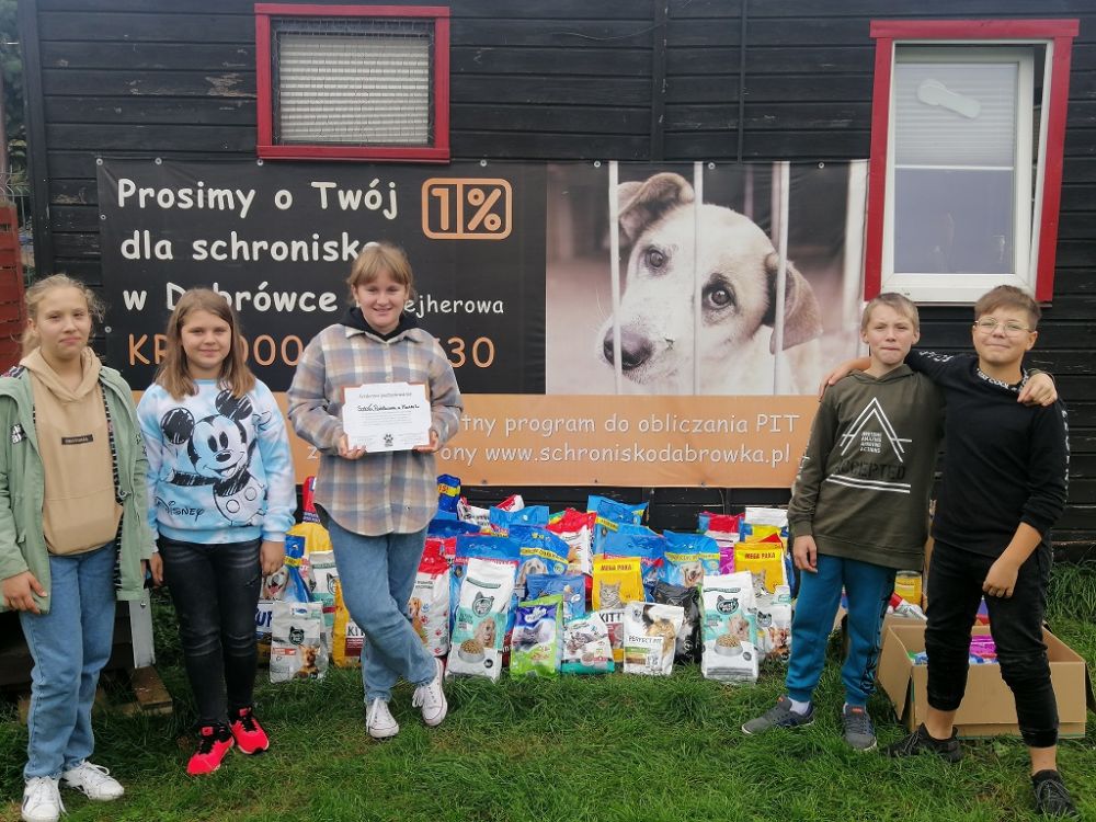 Dzisiaj w naszej szkole zakończyła się zbiórka karmy dla zwierzaków ze Schroniska OTOZ Animals w Dąbrówce, której pomysłodawczynią była uczennica kl. 7 Wiktoria Pilarska. Pięcioro uczniów z klasy 7 wraz z opiekunem SU dostarczyło dziś zebrane dary. Wspólnie zebraliśmy około 270 kg karmy suchej, mokrej oraz sporo smakołyków i przekąsek, a także innych akcesoriów. Szczególne podziękowania kierujemy do OSP Strzeszewo oraz okolicznych mieszkańców, którzy bardzo aktywnie włączyli się do tej szlachetnej akcji. Jesteśmy niezmiernie dumni, że w naszej szkole jest tak wiele uczniów, którzy są wrażliwi na krzywdę bezdomnych zwierząt.