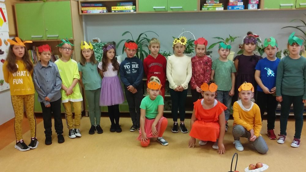 Uczniowie klasy drugiej przygotowali przedstawienie o tematyce jesiennej pt. „Jesienny bal” dla koleżanek i kolegów z oddziału przedszkolnego oraz z klasy pierwszej i trzeciej . W trakcie występu dzieci mogły dowiedzieć się jakie dary jesień przynosi do sadów i ogrodów oraz w jaki sposób można przechować owoce i warzywa na mroźne, zimowe dni. Po przedstawieniu aktorzy poczęstowali gości suszonymi owocami. Na zakończenie spotkania wszyscy razem zatańczyli jesiennego walczyka.