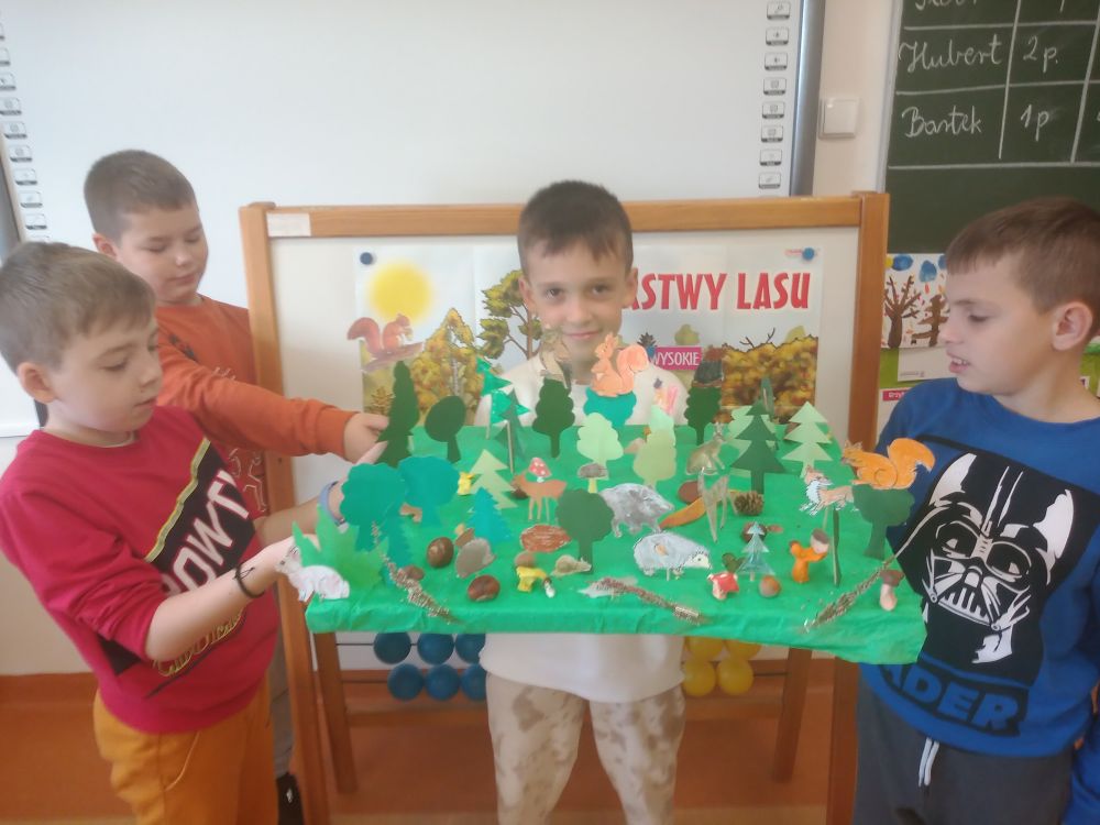 Zadaniem uczestników było wykonanie 5 zadań. Dzieci wykazały się dużymi wiadomościami związanymi z budową lasu. Wiedziały jakie warstwy tworzą roślinność w lesie i jakie zwierzęta występują w poszczególnej warstwie. Umiały również wymienić korzyści, jakie dają nam lasy. Chłopcy wykonali także makietę lasu. Uczniom bardzo podobała się tak forma utrwalenia wiadomości o lesie.