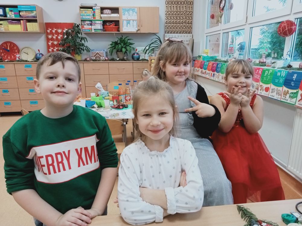 Świąteczny czas w klasie pierwszej upłynął szybko i w zgodnej, życzliwej atmosferze. Zaaferowane nadchodzącym Bożym Narodzeniem dzieci chętnie pracowały, dekorowały klasę i wspierały innych. Za ich wysiłek otrzymały prezenty 6. i 22. grudnia. Codziennie odkrywały okienka klasowego kalendarza adwentowego i wykonywały zapisane w nim zadania. Stworzyły naprawdę dłuuugi kolorowy łańcuch, którym udekorowały choinkę. Udekorowały klasę samodzielnie wykonanymi szklanymi kulami ze słoika, bombkami z kółek i stroikami. Brały udział w zajęciach otwartych z rodzicami. Poznały także tradycje bożonarodzeniowe w Polsce i na świecie. Wraz z 2. i 3. klasą odwiedziły pensjonariuszy w Domu Pomocy Społecznej nr 2 w Lęborku. Stworzyły kartki dla seniorów w ramach akcji "Wyślij kartkę do seniora". Napisały także życzenia dla swoich rodzin. Kolorowały obrus na wigilijny stół, co zapewne spowodowało, że wigilia była tak udana.