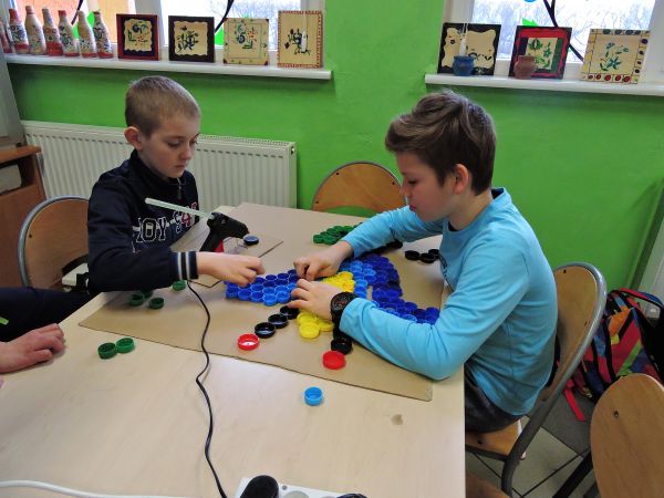Z odpowiednio połączonych plastikowych zakrętek mogą powstać bardzo ciekawe obrazy. W naszym przypadku są to elementy haftu kaszubskiego. Jak widać ze wszystkiego można zrobić coś przydatnego.