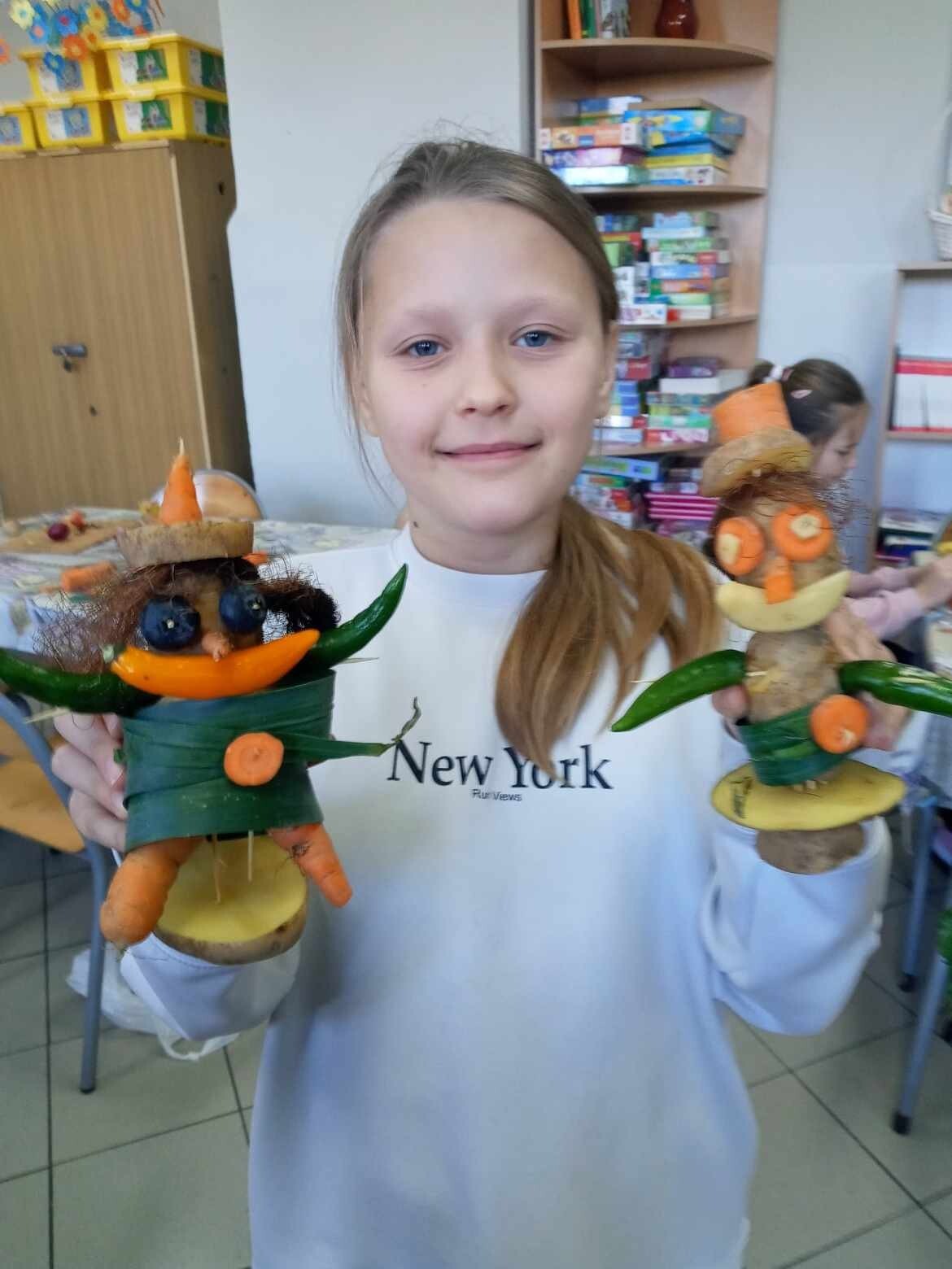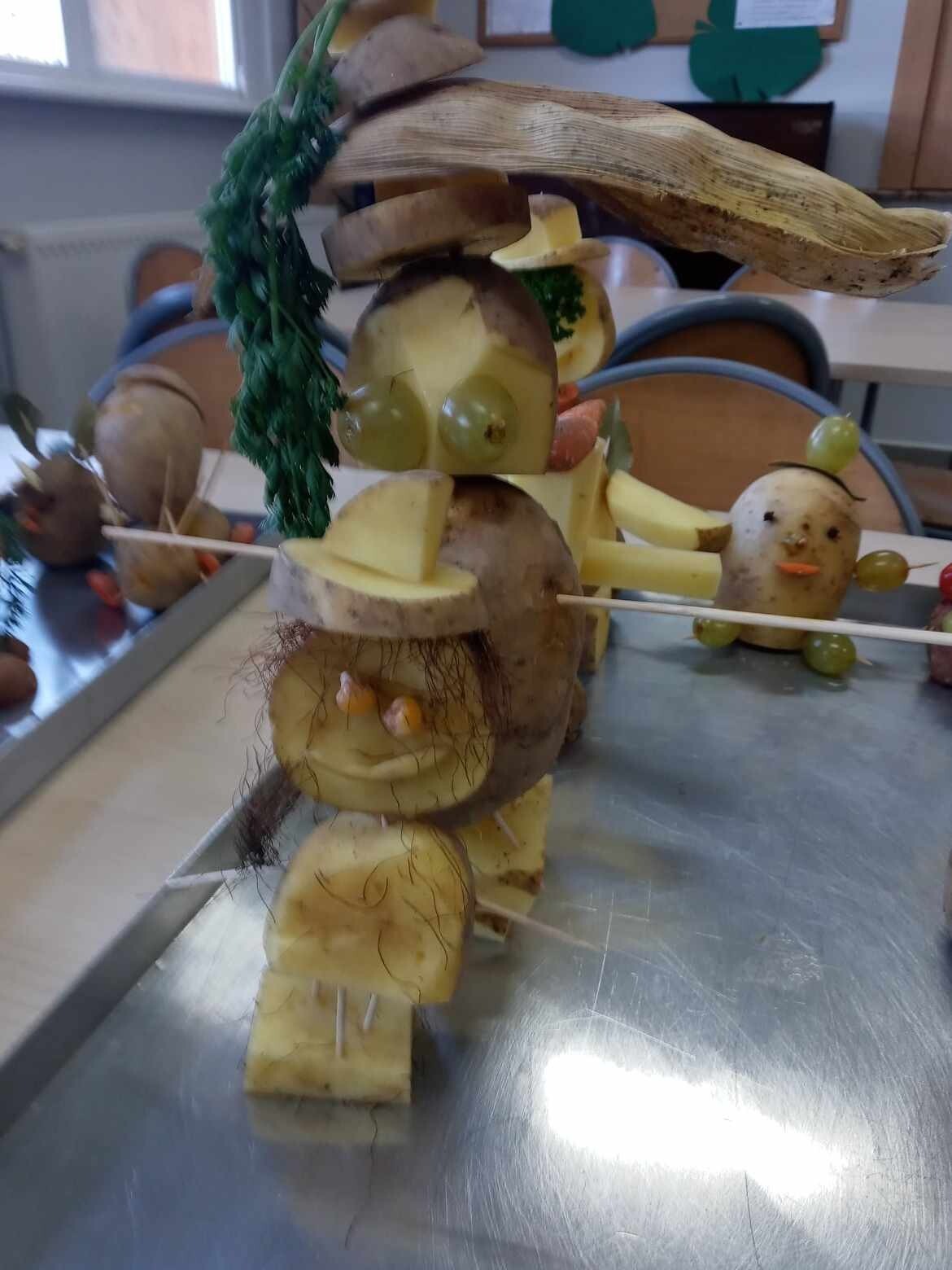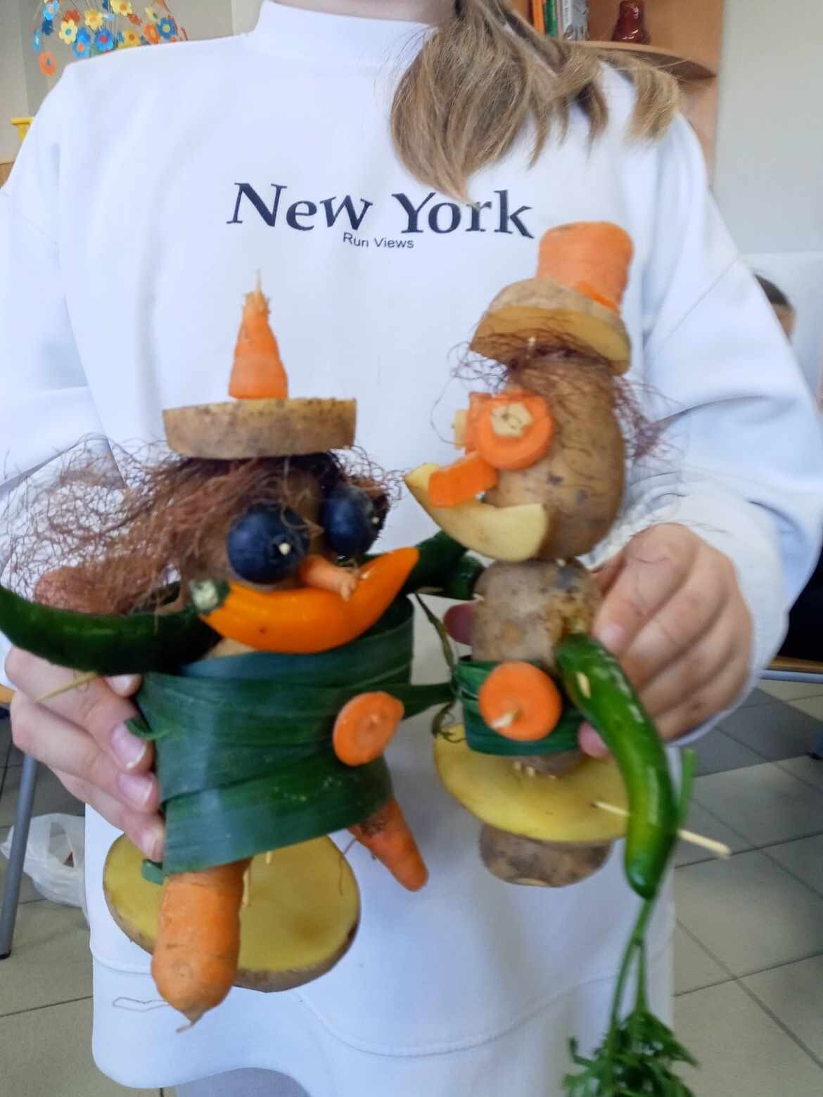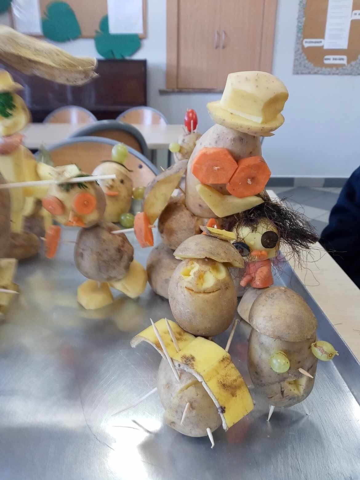 W październiku zrealizowane zostały lekcje z cyklu " Ciekawe lekcje języka kaszubskiego". Uczniowie przypomnieli sobie nazwy warzyw i owoców w języku kaszubskim, ich walory smakowe i zdrowotne. Zwieńczeniem zajęć było wykonanie " Bulwowego Króla i Królowej" oraz zabawnych postaci z warzyw i owoców. Kreatywność uczniów nie zna granic.